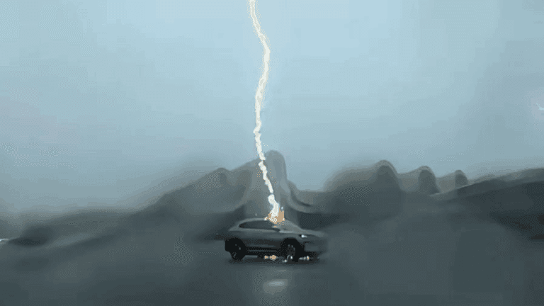အဲဒီဖြစ်ရပ်ဟာ မုန်တိုင်းထန်နေတဲ့အချိန်မှာ ဖြစ်ပွားခဲ့တာပါ။ BYD Song Plus EV ကားတစ်စီးဟာ ဝန်ဆောင်မှုဧရိယာတစ်ခုထဲကို ဖြတ်မောင်းနေတုန်းမှာ မိုးကြိုးတွေက ကားရဲ့ခေါင်မိုးပေါ်ကို ဆက်တိုက်ဆိုသလို ပစ်ခတ်ခဲ့တာ ဖြစ်ပါတယ်။