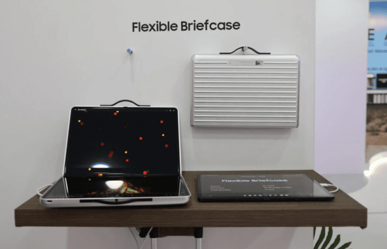 Samsung က Mobile World Congress (MWC) 2025 မှာ ဒီဇိုင်းဆန်းတဲ့ Flexible Briefcase ကို ပြသလိုက်ပါတယ်။ အဲဒါက လက်ဆွဲအိတ်လို သုံးနိုင်တဲ့ Foldable Laptop နမူနာမော်ဒယ် ဖြစ်ပါတယ်။ လက်ဆွဲအိတ်ကို ဖွင့်လိုက်ရင် 18.1” QD-OLED Display (QHD+ Resolution 2,000×2664 pixels) ပါတဲ့ Laptop ကို အသုံးပြုနိုင်မှာ ဖြစ်ပါတယ်။