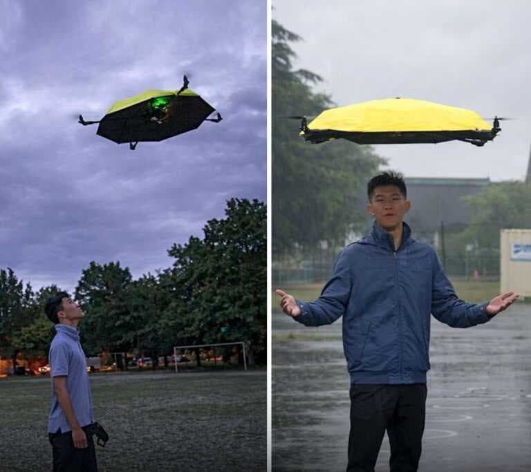 ဒီထီးကို Drone motor တွေ၊ flight stabilization စနစ်နဲ့ 3D-printed အစိတ်အပိုင်းတွေအပြင် ကျောပိုးအိတ်အသေးလေးထဲ ခေါက်ထည့်လို့ရပြီး ခိုင်ခိုင်မာမာ တပ်ဆင်နိုင်တဲ့ carbon-fiber nylon လက်တံတွေနဲ့ တည်ဆောက်ထားပါတယ်။ Code ပိုင်းဆိုင်ရာ မြှင့်တင်မှုတွေနဲ့ အကြိမ်ကြိမ် စမ်းသပ်မှုတွေ လုပ်ပြီးနောက်မှာတော့ ဒီ Flying Umbrella ဟာ ရည်ရွယ်ထားတဲ့အတိုင်း အလုပ်လုပ်လာခဲ့ပြီး ထီးကို လက်နဲ့ကိုင်စရာမလိုဘဲ မိုးဒဏ်ကနေ ကာကွယ်ပေးနိုင်ပြီ ဖြစ်ပါတယ်။